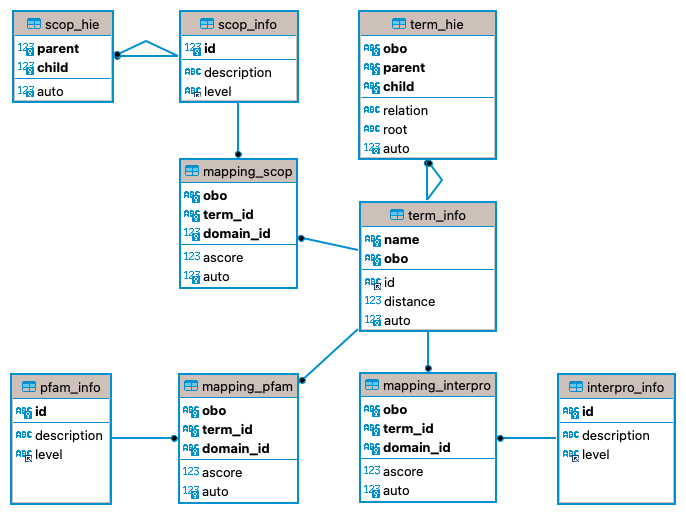 mysql> USE dcGOdb; mysql> SHOW tables; +------------------+ | interpro_info | | mapping_interpro | | mapping_pfam | | mapping_scop | | pfam_info | | scop_hie | | scop_info | | term_hie | | term_info | +------------------+